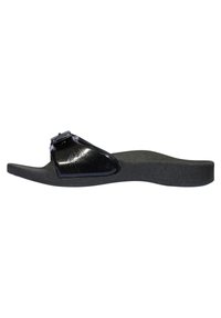 Chausson noir en plastique avec une épaisse sangle tressée et une semelle plate, présenté en profil latéral sur un fond blanc.