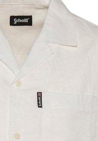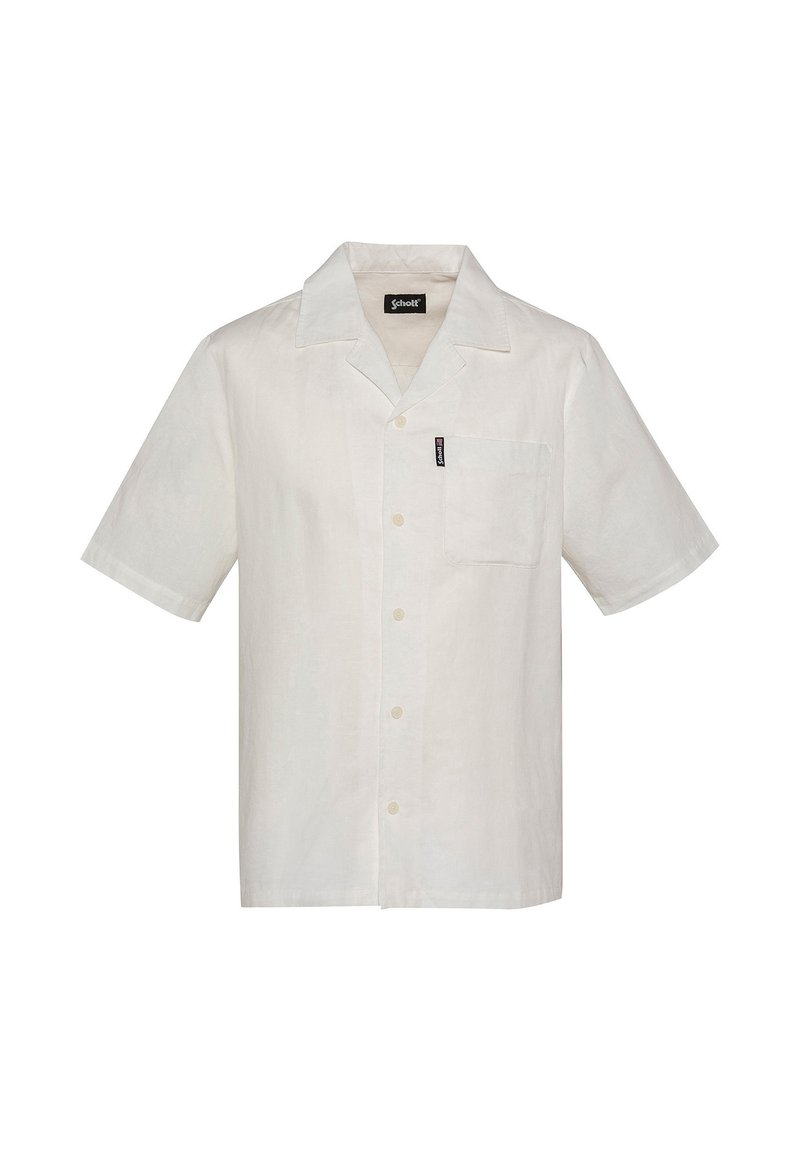 Chemise blanche à manches courtes avec boutons, poche avant et col, arborant une petite étiquette noire de la marque Schott sur la poche.
