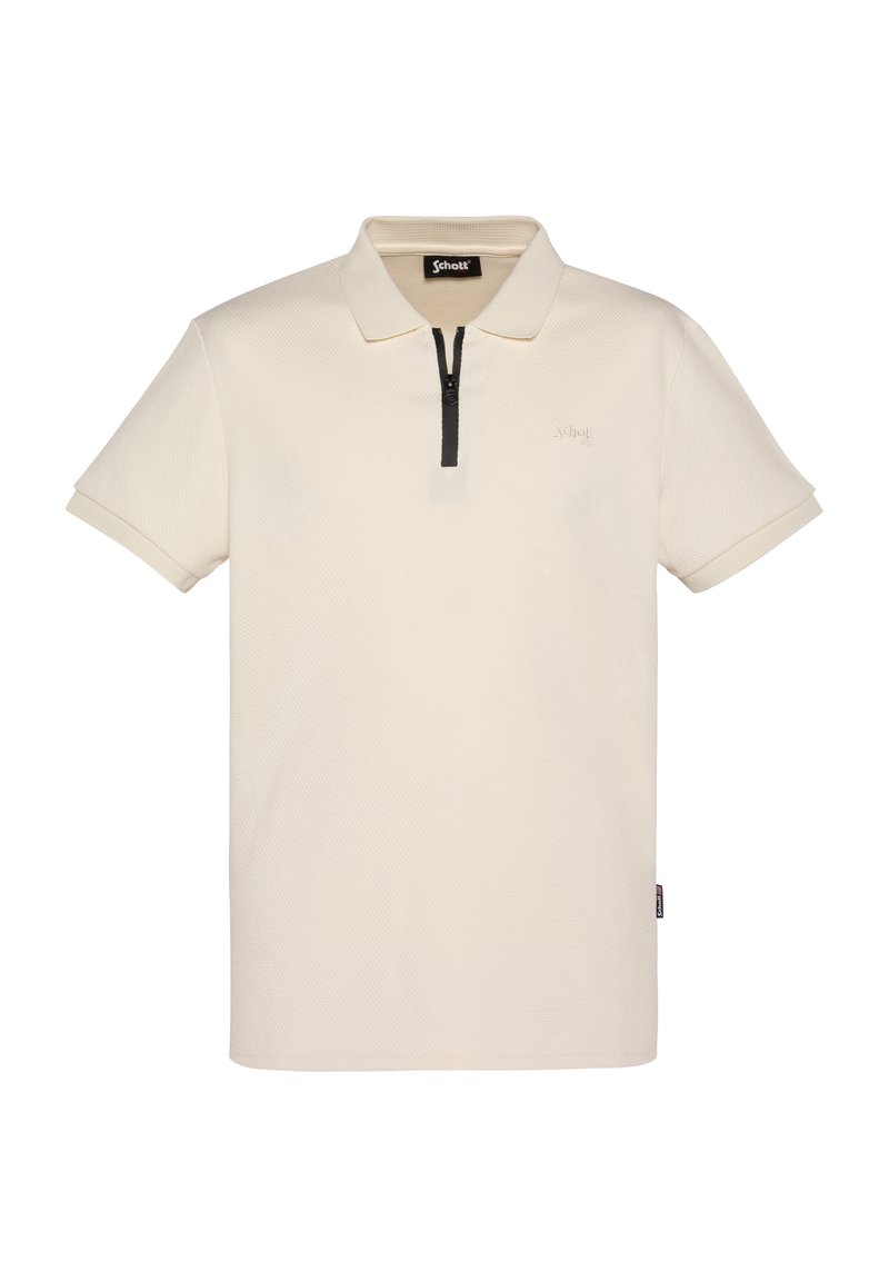 Polo crème à manches courtes en tissu texturé, fermeture à glissière noire sur la moitié, col plié et logo subtil sur la poitrine.