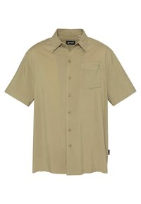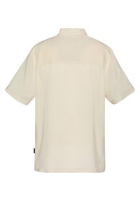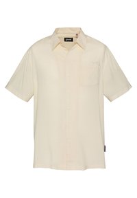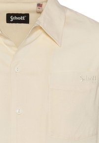 Chemise à manches courtes de couleur crème, boutonnée sur le devant, avec col pointu et poche poitrine brodée du nom de la marque "Schott".