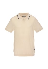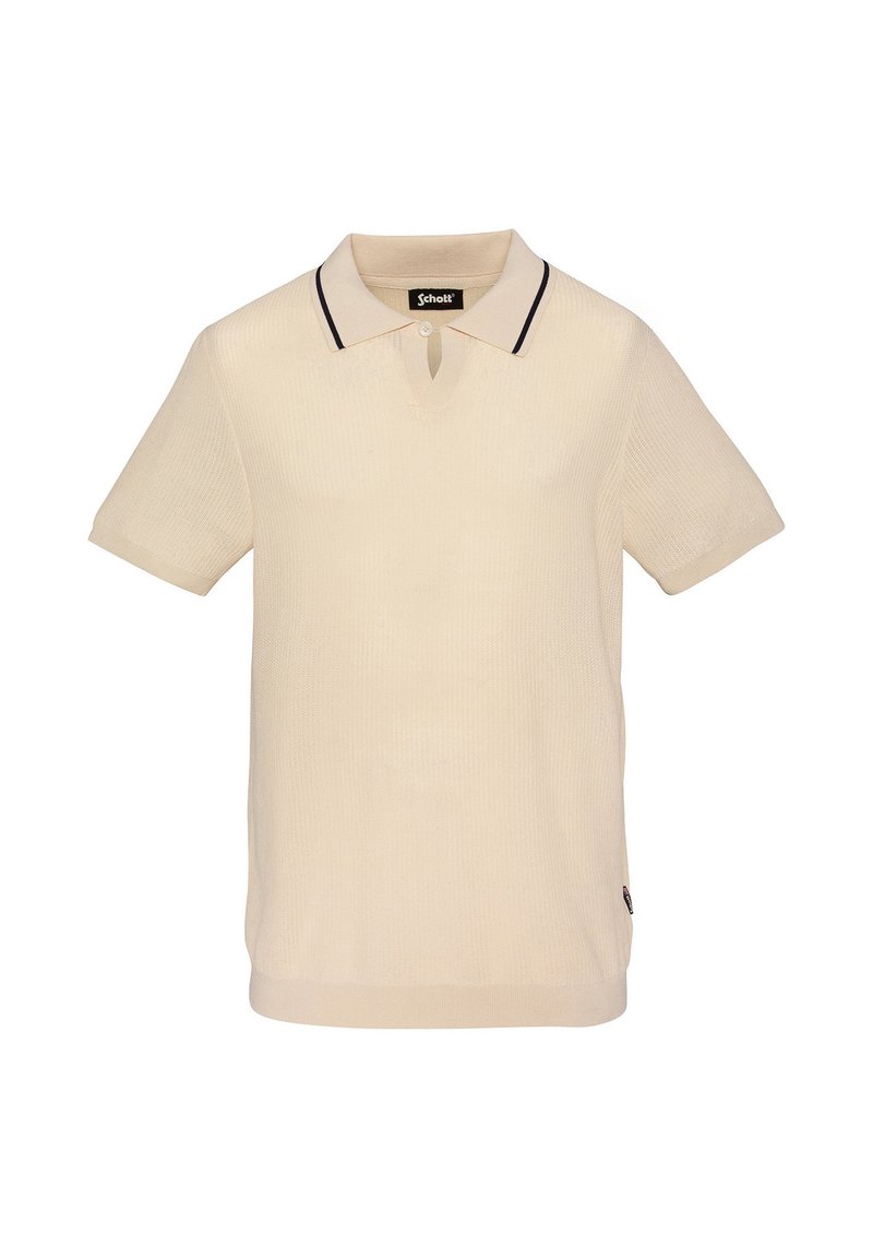 Polo en maille à manches courtes beige avec bordure noire sur le col, encolure à bouton avec fente, et étiquette Schott à l'intérieur du col.