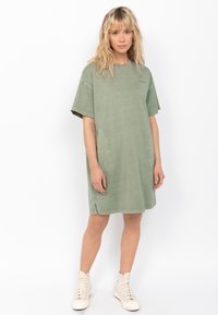 Robe t-shirt verte ample en coton, avec des manches courtes, des poches latérales et de petites fentes sur les côtés à l'ourlet.