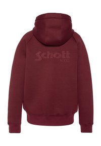 Sweat à capuche zippé couleur marron foncé avec doublure intérieure de la capuche grise, poches kangourou à l'avant, cordons, poignets côtelés, et logo "Schott" sur la poitrine ainsi que sur l'étiquette du col.