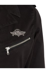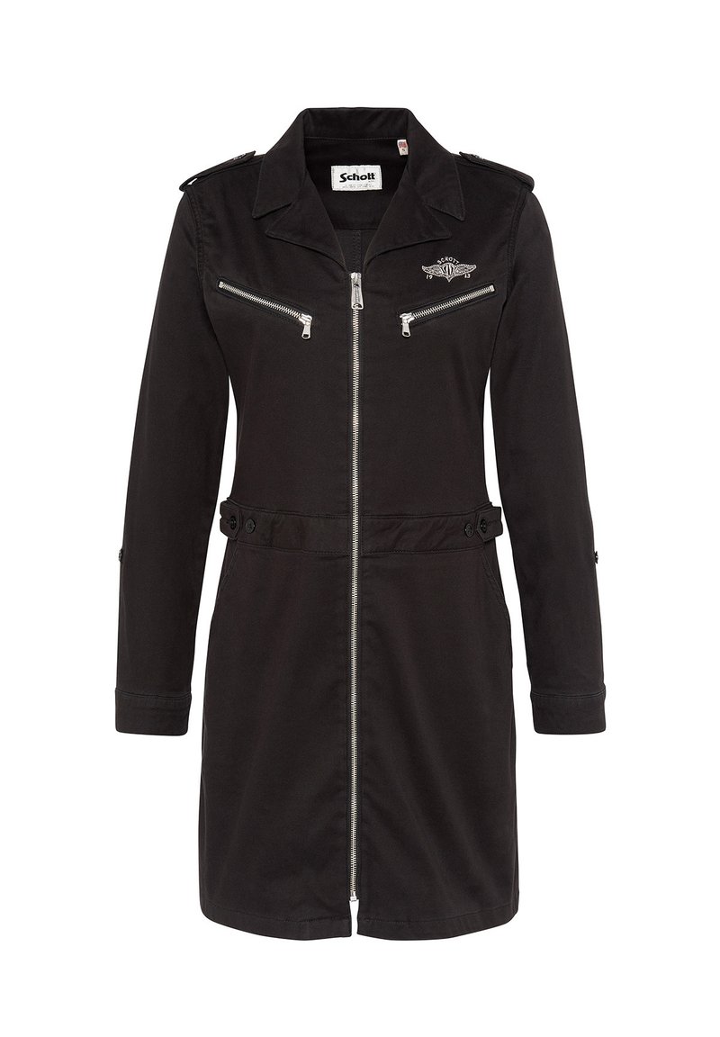 Manteau trench en coton noir avec une fermeture éclair à l'avant, deux poches poitrine zippées, des épaulettes et des détails de taille boutonnés. Manches longues et col.