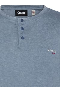 Chemise henley à manches courtes bleue en coton doux, dotée de trois boutons au niveau du cou et d'un logo minimaliste sur la poitrine.