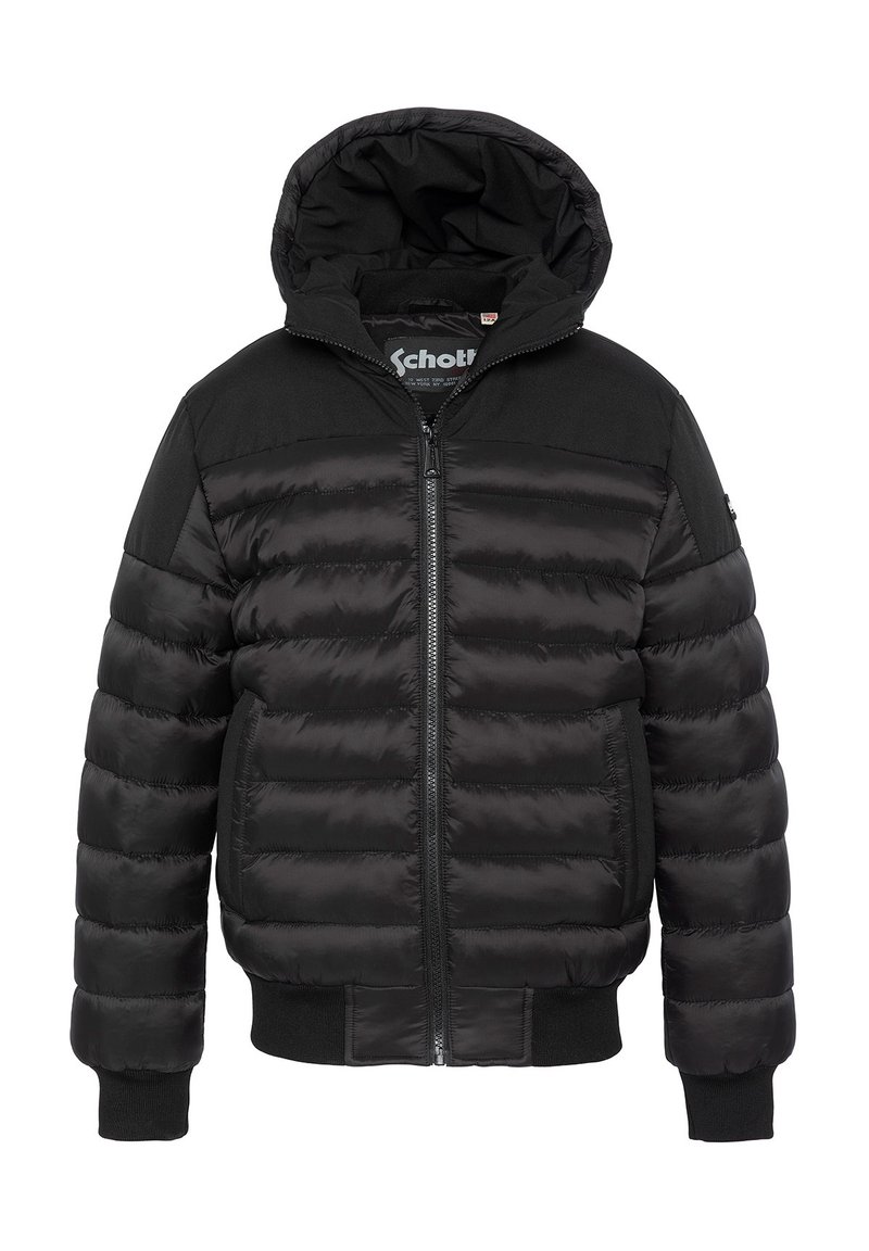 Veste matelassée noire avec fermeture éclair à l'avant, capuche avec cordon de serrage et poignets côtelés. Présente un mélange de matériaux brillants et mats avec un design matelassé horizontal.
