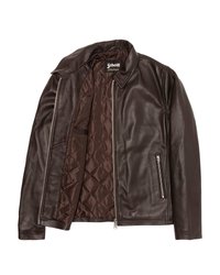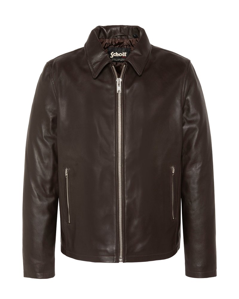 Veste en cuir marron foncé avec fermeture éclair frontale, deux poches latérales zippées et un col plié, étiquetée Schott à l’intérieur du col.