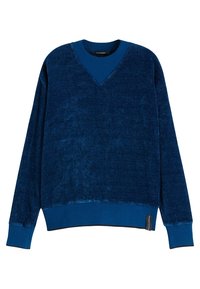 Sweat-shirt bleu à col en V en tissu doux et texturé. Manches longues avec poignets et ourlet côtelés. Logo sur une étiquette sur le côté inférieur.