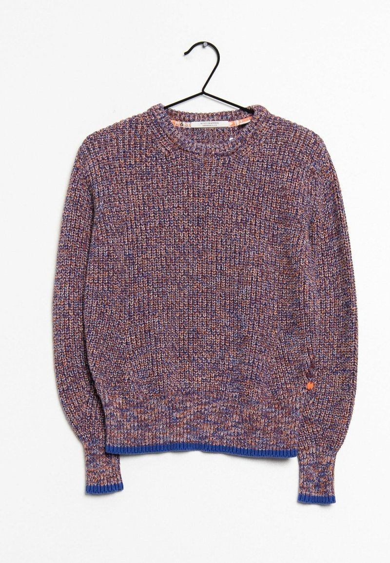 Pull en maille avec un motif moucheté violet, bleu et orange. Col rond, poignets et ourlet côtelés en bleu uni. Suspendu à un crochet noir.
