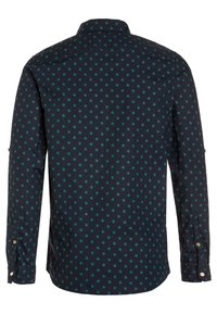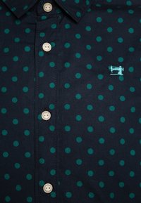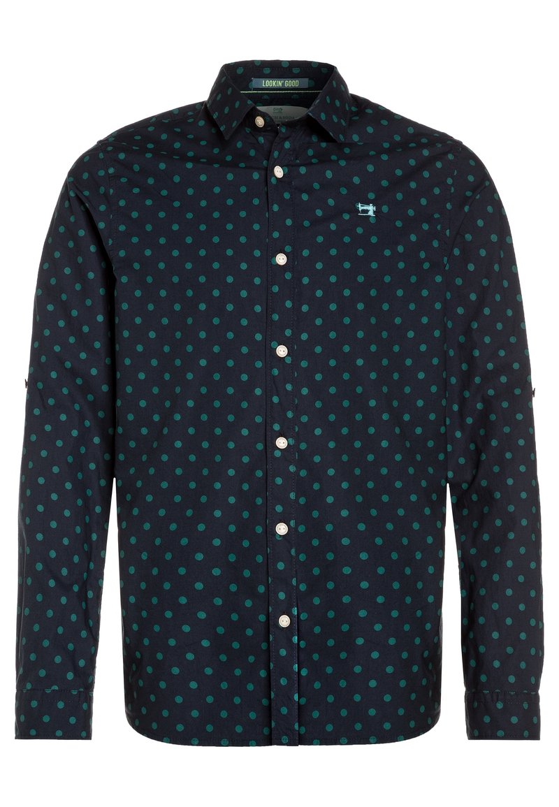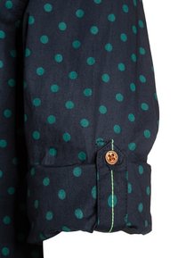 Chemise à manches longues bleu marine avec des pois verts, col boutonné et boutons blancs. Présente un petit logo sur la poitrine.