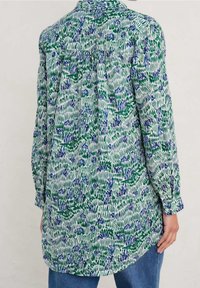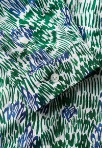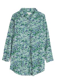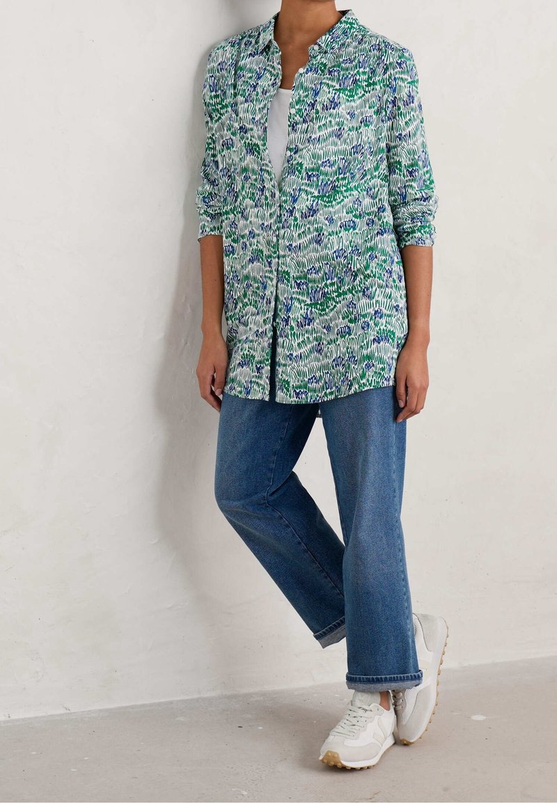 Chemise à motifs verts et bleus à manches longues, col classique, associée à un jean en denim bleu et des baskets blanches.