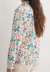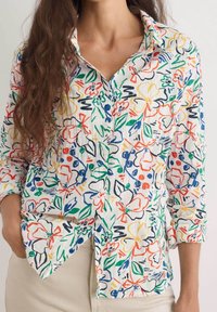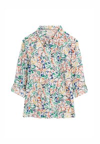 Chemise blanche à boutons ornée d'un motif floral multicolore. Le tissu semble léger avec une légère texture. Design à col avec manches retroussées.