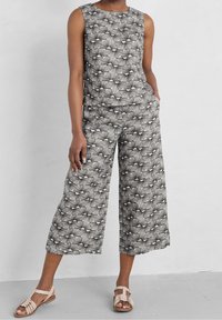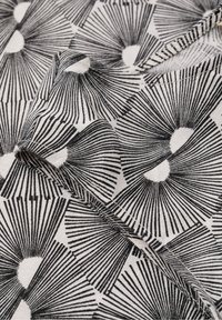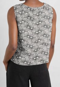 Haut sans manches noir et blanc avec motif géométrique en rayons de soleil, porté avec un pantalon noir, mains dans les poches, sur fond uni.