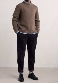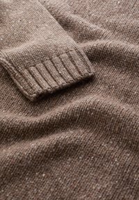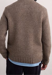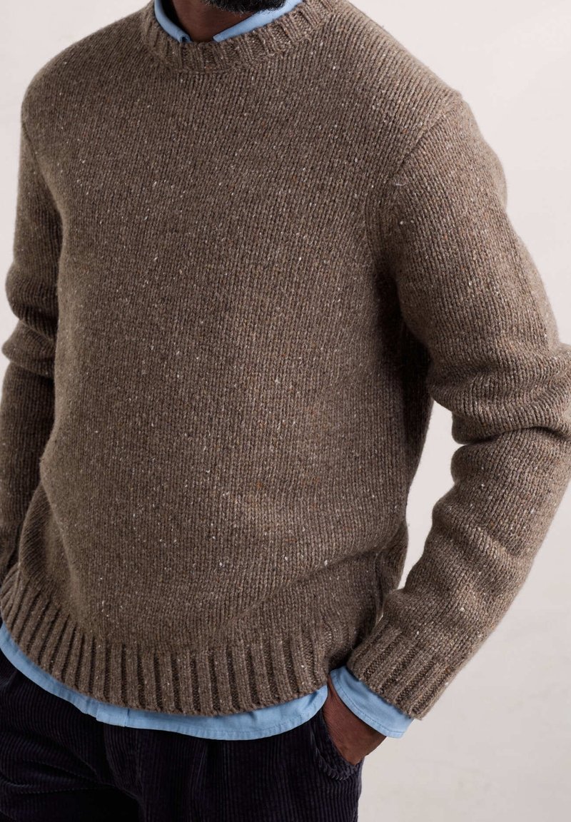 Pull marron tricoté avec un col rond et un ourlet côtelé. Présente un tissu texturé avec des éclats de couleurs plus claires, superposé sur une chemise bleue.