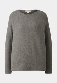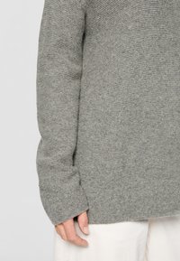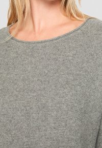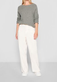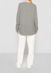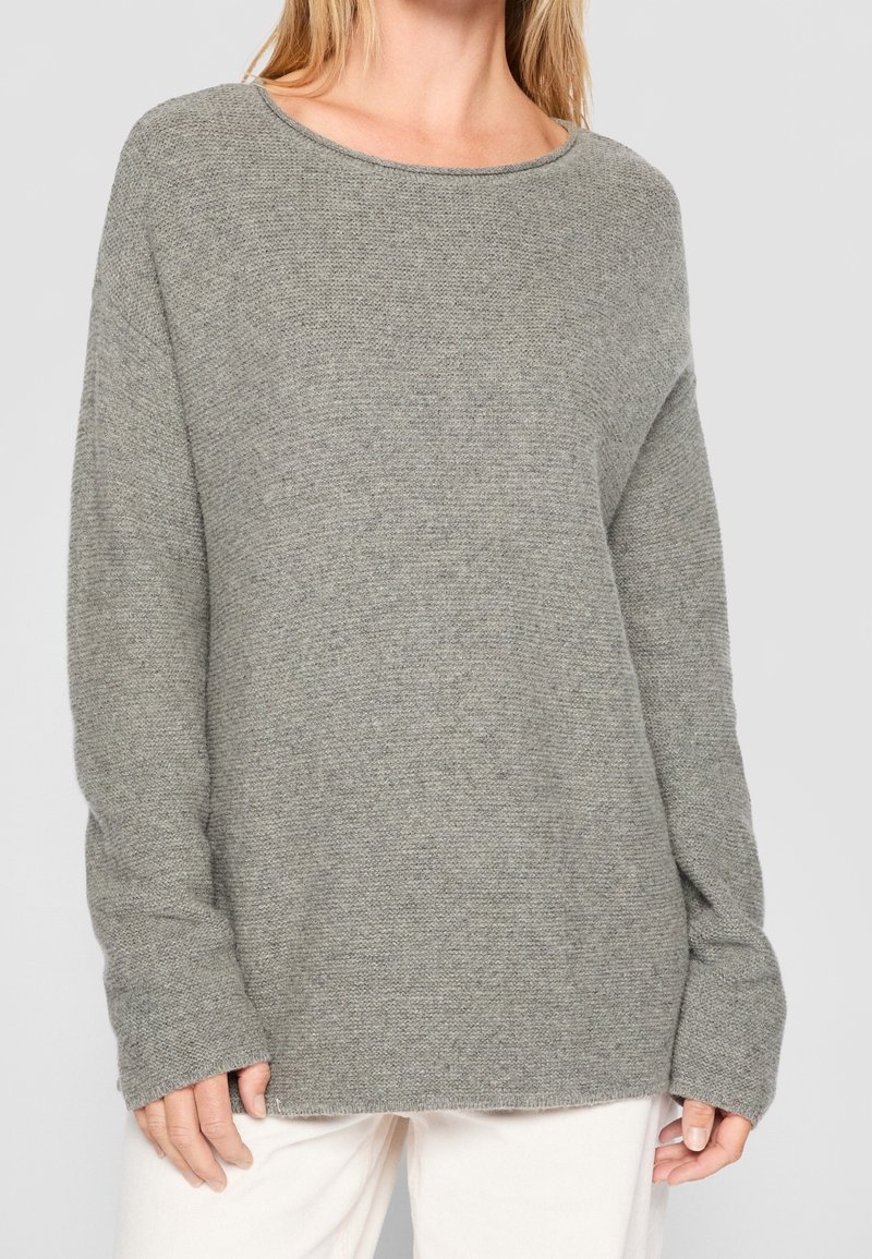 Femme portant un pull gris ample en tricot avec des manches longues et un col rond, associé à un pantalon blanc.