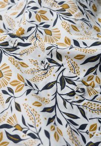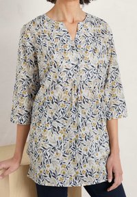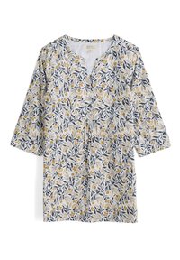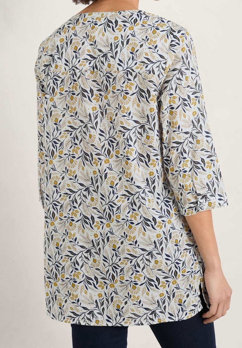 Tunique fleurie à manches trois-quarts avec une base blanche, des feuilles bleu marine et des accents floraux jaunes, en tissu léger.
