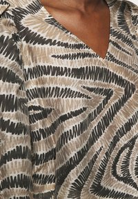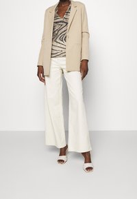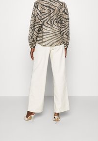 Femme portant un chemisier à manches longues avec un motif abstrait en zigzag beige et noir, associé à un pantalon taille haute blanc cassé.