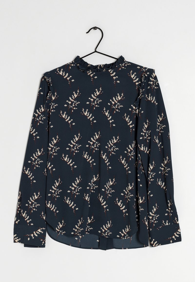 Blouse bleu marine à manches longues avec motif floral blanc, col à volants et bas légèrement arrondi, présentée sur un cintre noir.