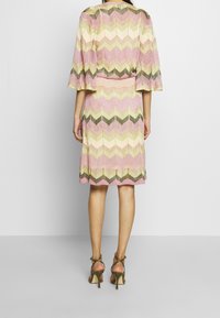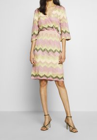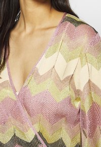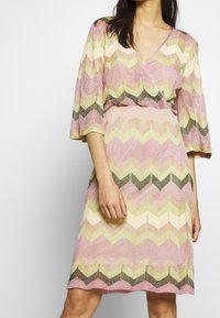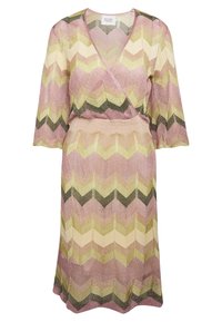 Robe mi-longue avec un design portefeuille, présentant un motif chevron en rose, jaune, vert et noir. Matière en maille texturée et manches évasées.