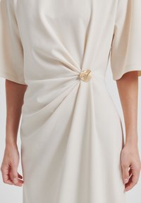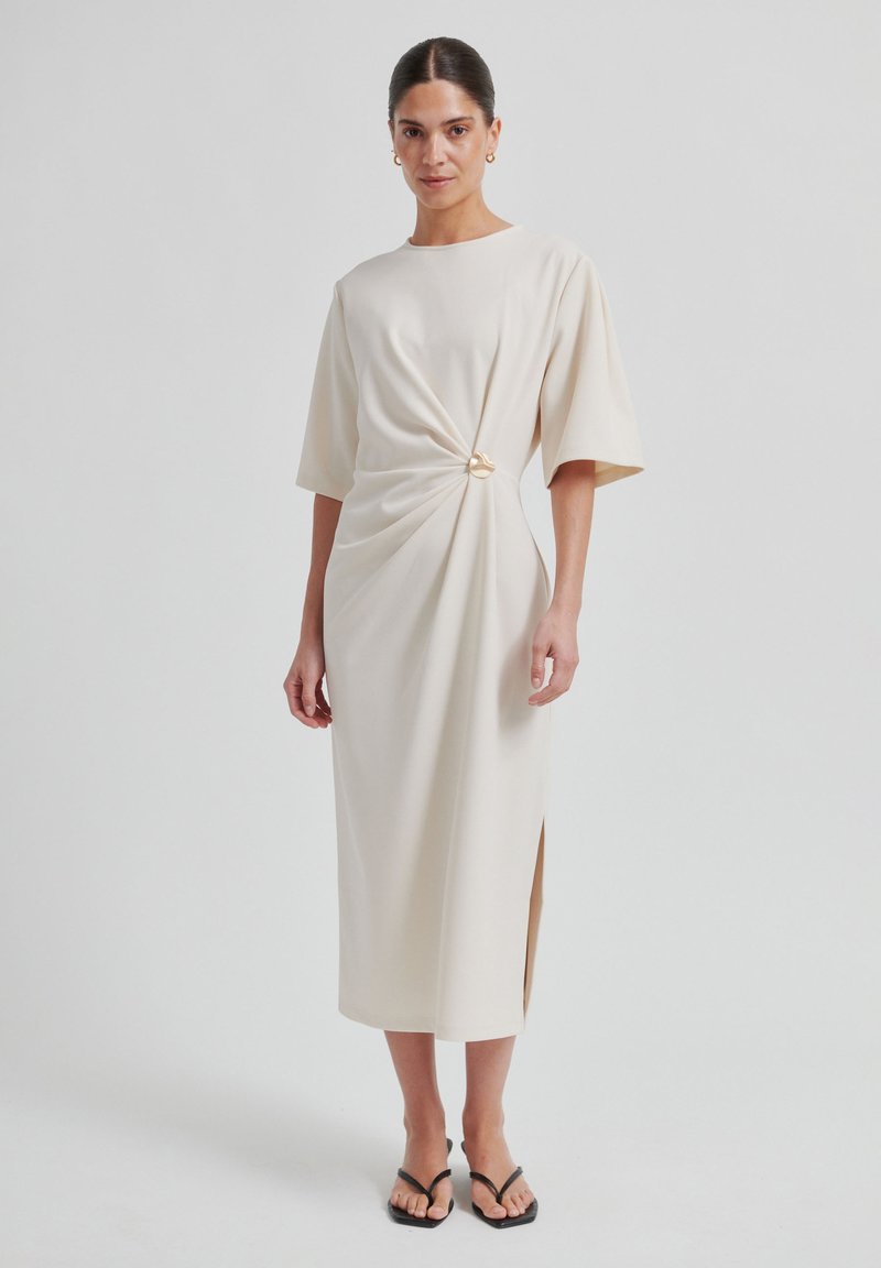 Robe beige longueur genou avec manches courtes, dotée d'un détail torsadé à la taille et d'un accent doré. Tissu lisse avec une fente latérale.