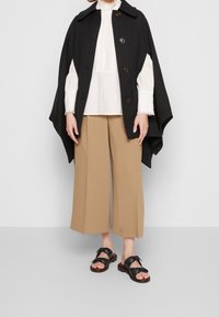 Personne portant une cape noire à boutons sur un blouse blanche avec col en dentelle et un pantalon beige taille haute, se tenant dehors.