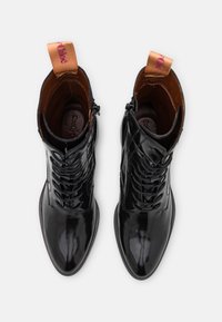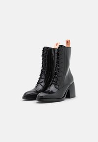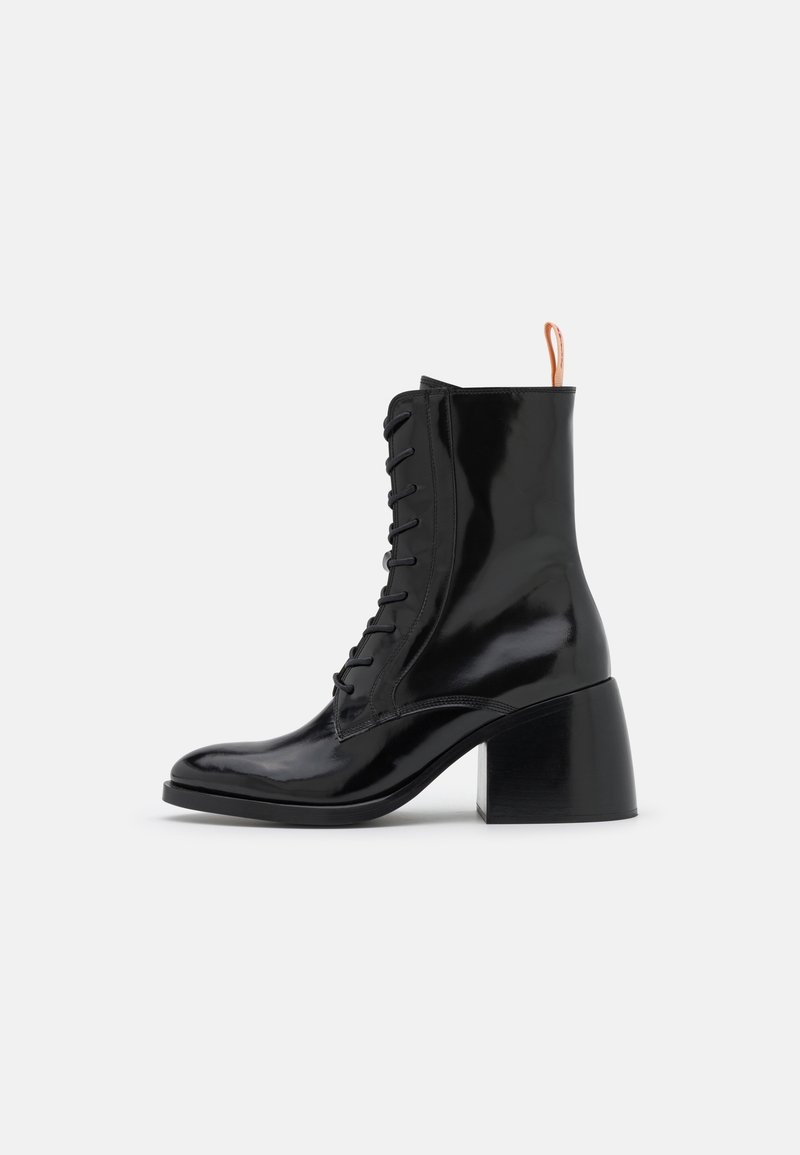 Bottines en cuir verni noir avec un bout rond, un laçage à l'avant et un talon bloc épais et haut ; présentant une languette à boucle contrastante.
