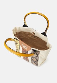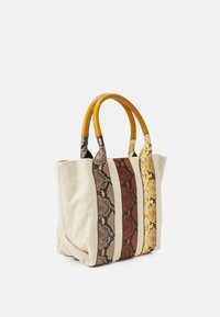 Sac cabas en toile beige avec trois bandes verticales en cuir à motif peau de serpent et poignées arrondies jaune moutarde.