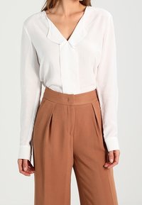 Femme portant un blouse blanche à manches longues et décolleté en V, rentré dans un pantalon marron à taille haute et jambes larges.