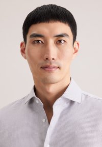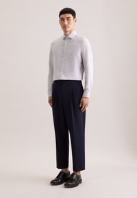 Chemise gris clair à motif avec col boutonné, manches longues et coupe décontractée, associée à un pantalon tailleur bleu marine.