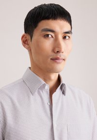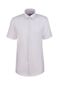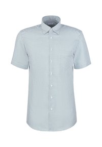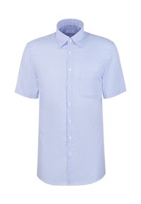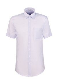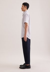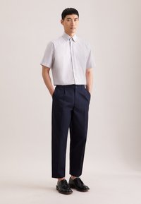 Homme portant une chemise à manches courtes à carreaux clairs, rentrée dans un pantalon bleu marine foncé à plis, debout devant un fond uni.