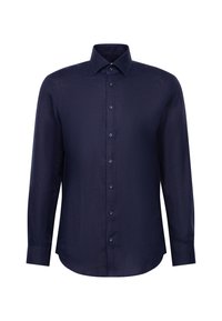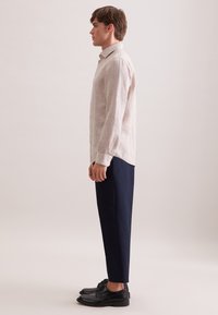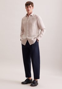 Jeune homme portant une chemise en lin à manches longues beige clair et un pantalon bleu marine foncé, debout les mains dans les poches devant un fond uni.