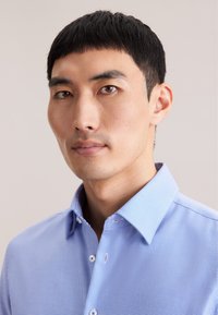 Chemise bleu clair à boutons avec un motif texturé, manches longues et col classique. Associée à un pantalon bleu marine foncé.