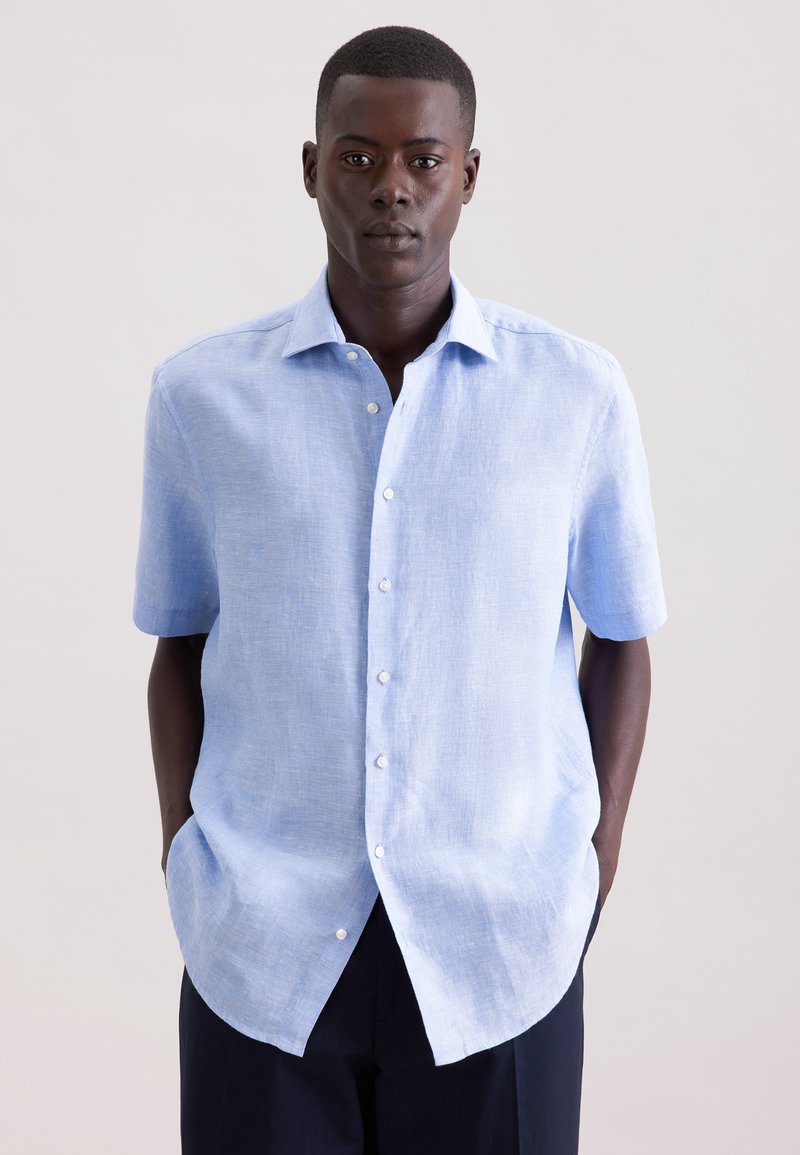 Homme debout, les mains dans les poches, portant une chemise bleu clair à manches courtes boutonnée et un pantalon foncé, sur un fond uni.