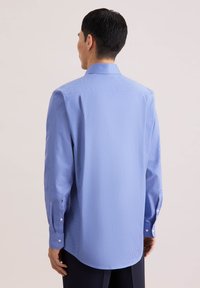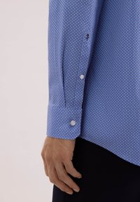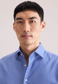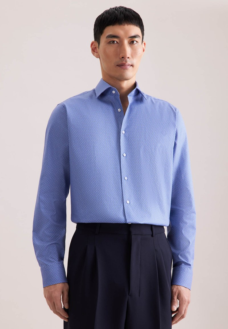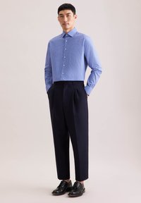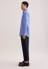 Homme portant une chemise à manches longues boutonnée bleu clair à motifs, rentrée dans un pantalon noir plissé, sur un fond uni.