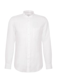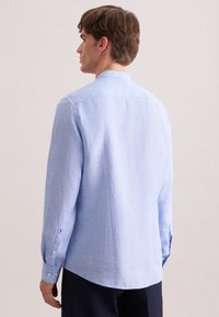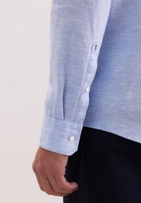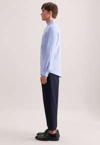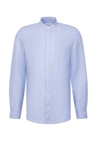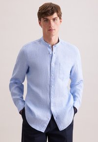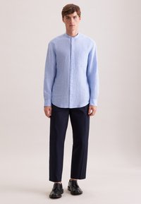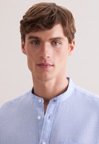 Jeune homme portant une chemise bleu clair à manches longues avec col mandarin et boutons, mains dans les poches, sur un fond clair uni.