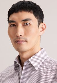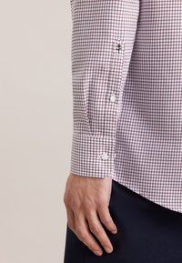 Chemise à carreaux rouge et blanche, à manches longues, avec col et poche poitrine, assortie à un pantalon bleu marine foncé.