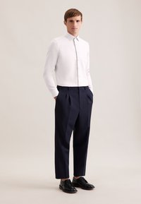 Chemise gris clair à manches longues avec un col boutonné, présentant une texture lisse et une brillance subtile, associée à un pantalon bleu marine foncé.