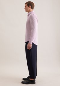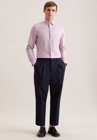 Homme portant une chemise à manches longues rose clair boutonnée et un pantalon plissé bleu marine foncé, debout devant un fond beige uni.