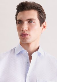 Chemise bleu clair boutonnée avec un motif géométrique subtil, manches longues, une poche sur la poitrine gauche et un col classique.