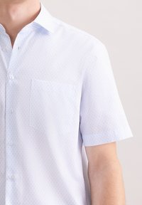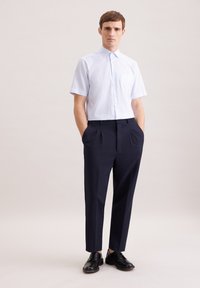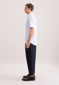 Homme en chemise blanche à manches courtes boutonnée et pantalon foncé, debout les mains dans les poches devant un fond clair uni.