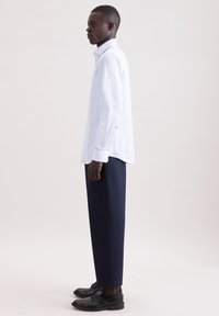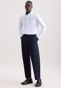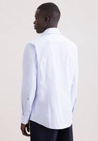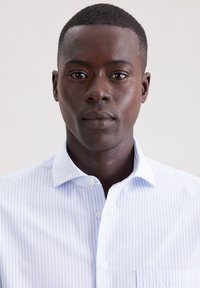 Homme portant une chemise à fines rayures bleu clair et blanc, à boutons et manches longues, ainsi qu'un pantalon foncé, debout devant un fond clair uni.