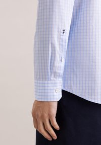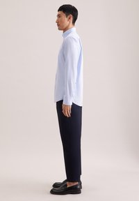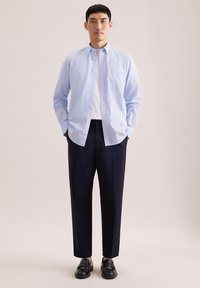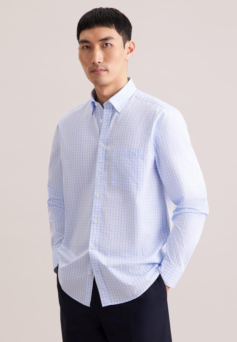 Homme portant une chemise à carreaux bleu clair à manches longues et un pantalon noir, debout devant un fond uni.