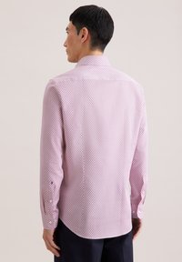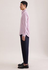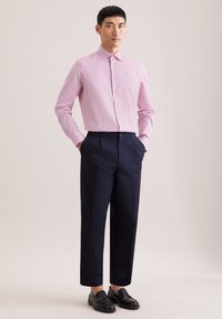 Homme portant une chemise à manches longues avec un motif géométrique rose et un pantalon sombre, debout devant un fond clair uni.