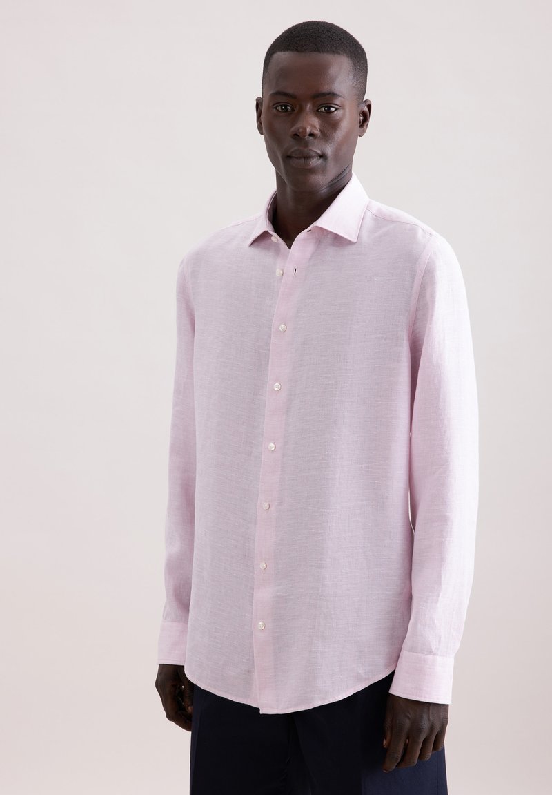 Homme portant une chemise à manches longues rose pâle avec col et boutons, debout devant un fond clair uni.