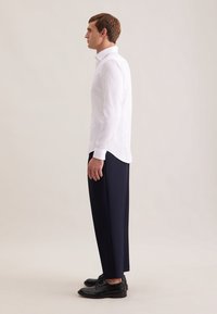 Chemise blanche à manches longues avec col classique, texture douce et boutons beiges, associée à un pantalon foncé plissé.