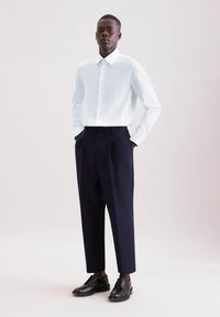 Homme portant une chemise blanche boutonnée et un pantalon foncé, debout face à un fond clair uni, regardant droit devant.