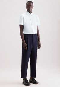 Homme portant une chemise blanche à manches courtes avec boutons, un pantalon de costume bleu marine et des chaussures habillées noires, debout devant un fond uni.