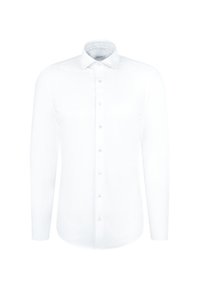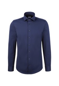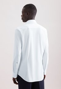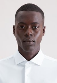 Homme portant une chemise blanche à manches longues boutonnée, rentrée dans un pantalon plissé bleu marine taille haute, debout devant un fond uni.