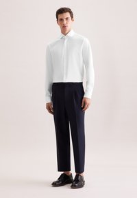 Jeune homme portant une chemise blanche cintrée à boutons, rentrée dans un pantalon plissé foncé, debout les mains dans les poches devant un fond uni.