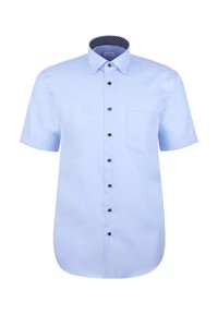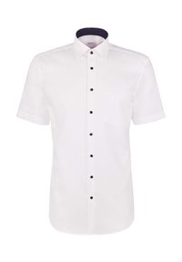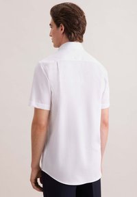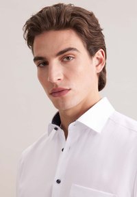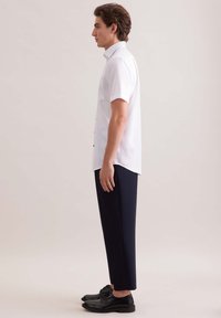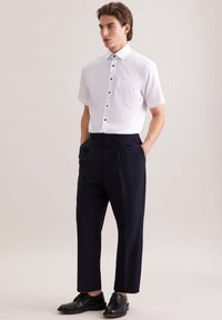 Jeune homme portant une chemise blanche à manches courtes avec des boutons noirs et un pantalon bleu marine, debout devant un fond clair uni.